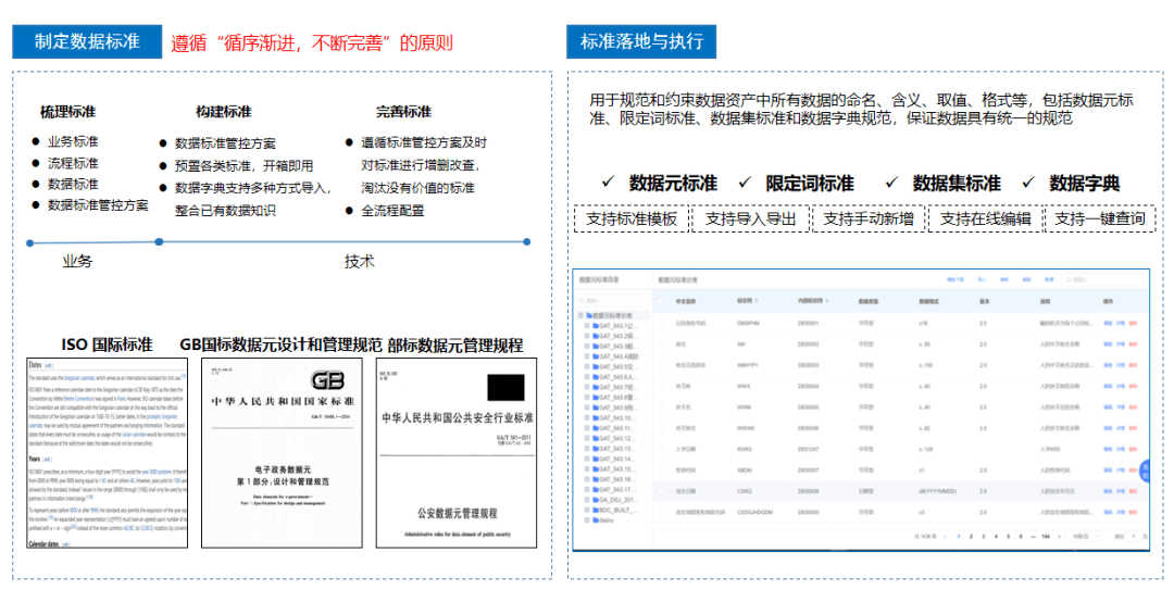 标准落地与执行:用于规范和约束数据资产中所有数据的命名、含义、取值、格式等,包括数据元标准、限定词标准、数据集标准和数据字典规范,保证数据具有统一的规范