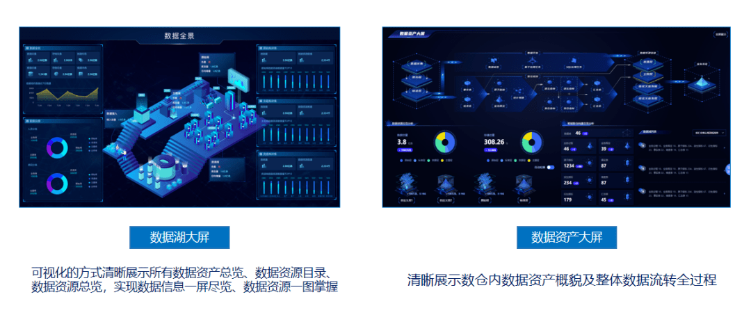 数据湖大屏:可视化的方式清晰展示所有数据资产总览、数据资源目录、数据资源总览,实现数据信息一屏尽览、数据资源一图掌握