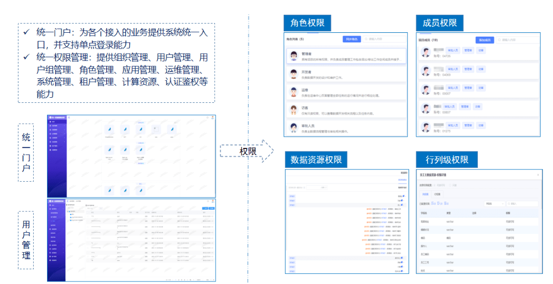 统一权限管理:提供组织管理、用户管理、用户组管理、角色管理、应用管理、运维管理、系统管理、租户管理、计算资源、认证鉴权等能力
